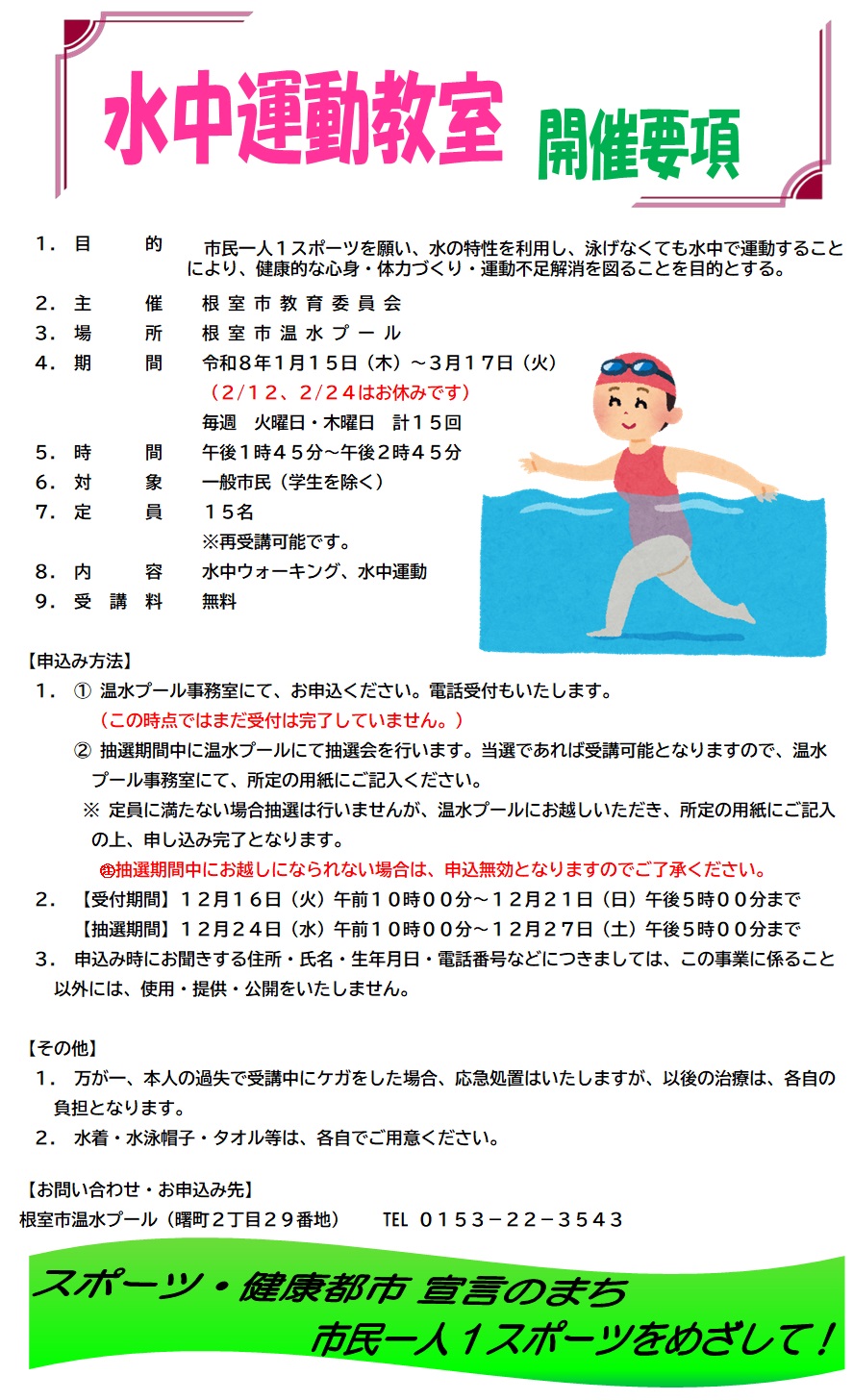 水中運動教室の受講者を募集します 【対象:一般市民(学生除く)】 この記事に関するお問い合わせ先 教育委員会スポーツ課温水プール〒087-0006北海道根室市曙町2丁目29番地根室市温水プール内電話番号:0153-22-3543 ファックス:0153-23-3392温水プールへのお問い合わせはこちら Tweet 更新日:2025年11月28日