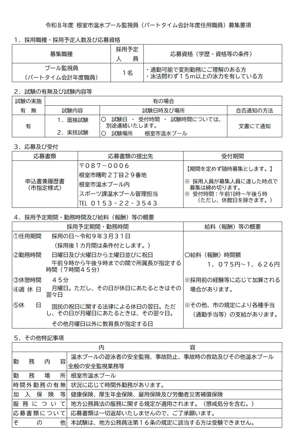 〇試験会場:根室市温水プール