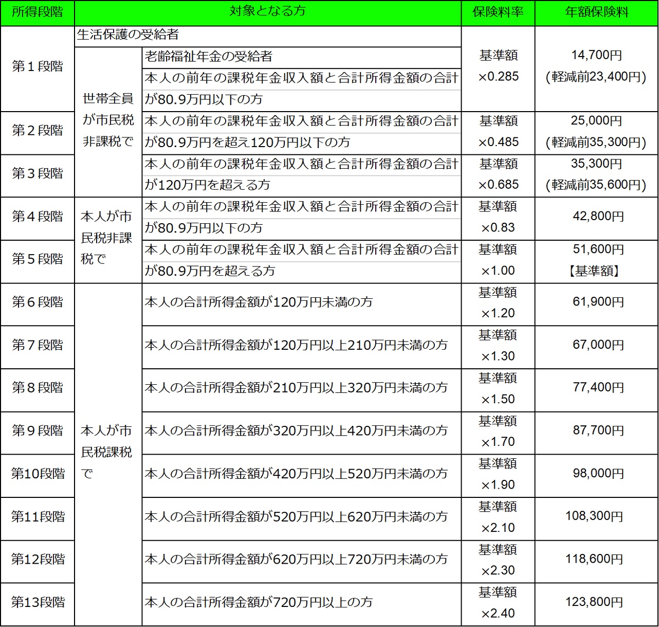 介護保険料は3年間の介護サービスにかかる費用をもとに算出し、一人あたりの平均的な保険料額(基準額)を決定しています。(根室市の基準額は年額51,600円)皆さまの保険料は、基準額をもとに一人ひとりの収入などに応じて13段階に分けられます。