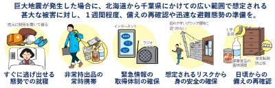 情報が発信されてから1週間程度は、普段通りの生活や社会経済活動を継続した上で、いつもより地震の発生に注意して、家具の固定や安全な避難場所・避難経路の確認など地震への備えを再確認し、いち早く避難できるよう準備をしてください。