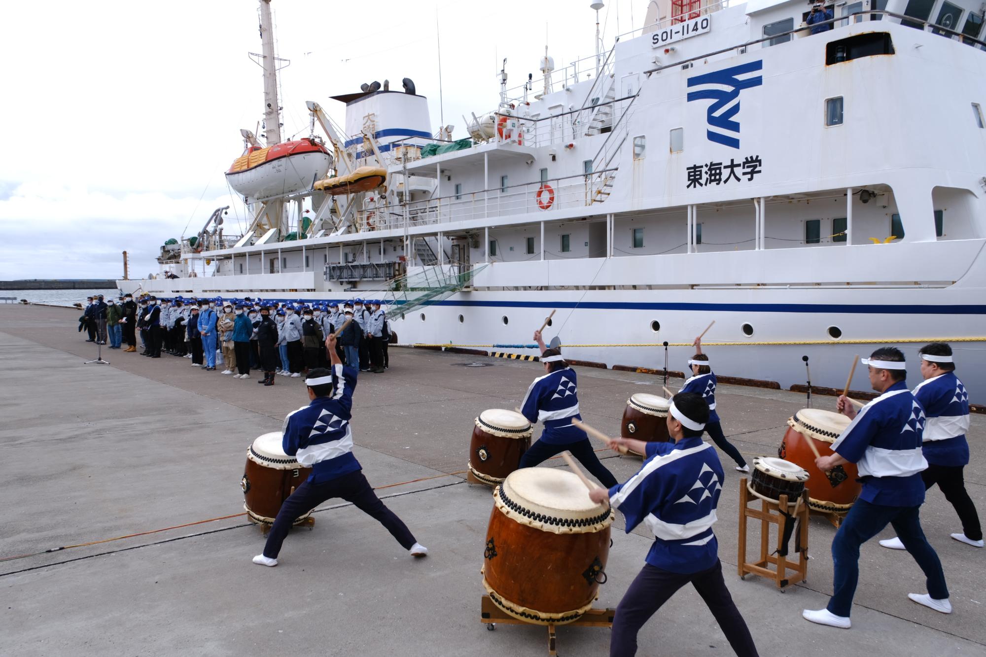 4日朝、東海大学海洋学部の海洋調査研修船『望星丸』が海洋文明学科の学生や教職員ら約130人を乗せ、花咲港に入港。郷土芸能ねむろ太鼓の演奏で迎え入れられると、代表して川崎一平人文学部長が「約10年ぶりとなる望星丸の入港で“ただいま戻りました”という思い。学生は3日間にわたる市内での研修で、根室の自然、歴史、文化などをしっかり学ばせていただく。」とあいさつしました。