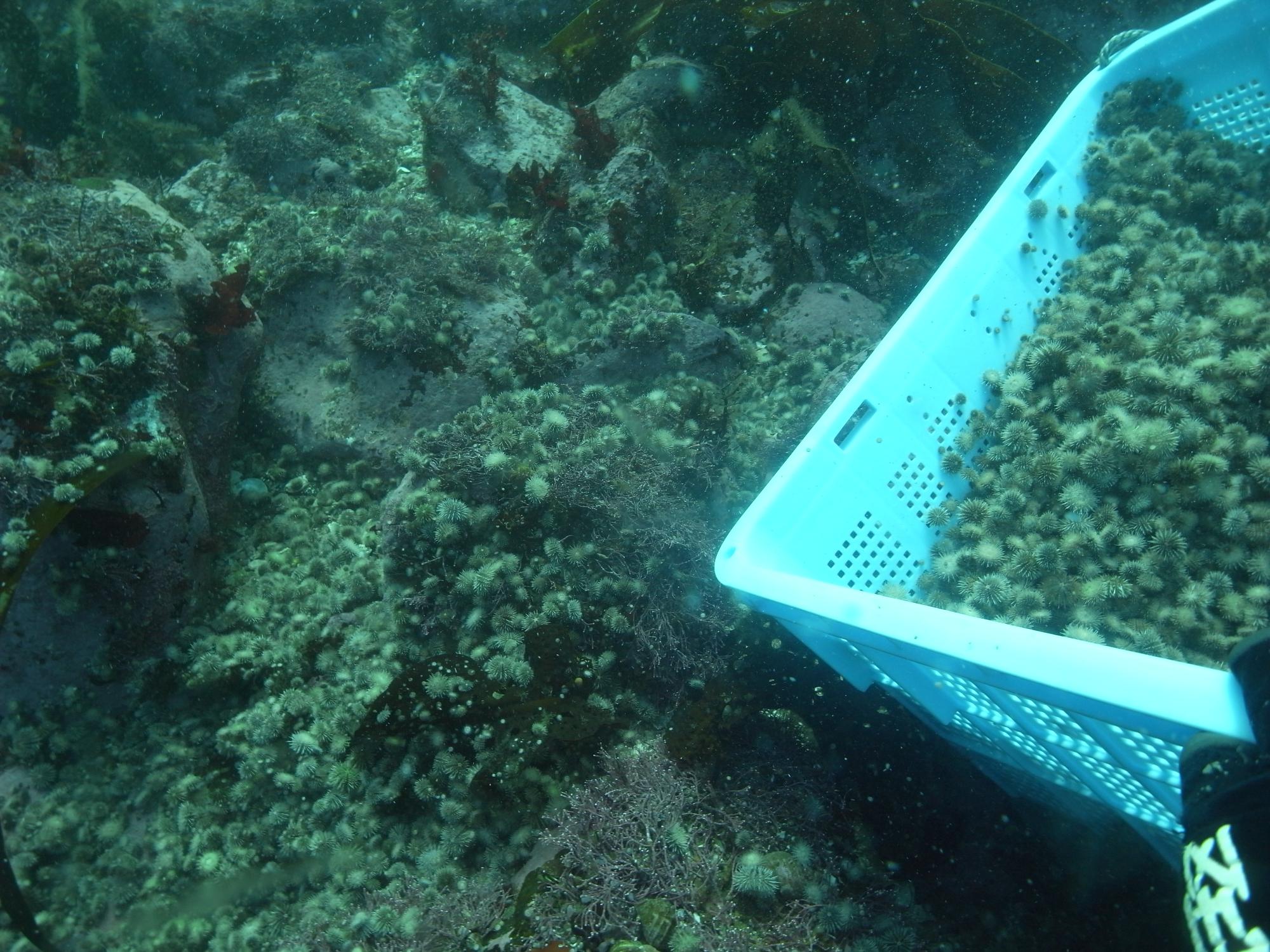 稚ウニの生産は漁業被害を受けて昨年から市栽培漁業研究センターにて行っており、今年は5月に親ウニから採苗して飼育を開始。計画していた数量70万粒を上回る93万粒を生産することができました。