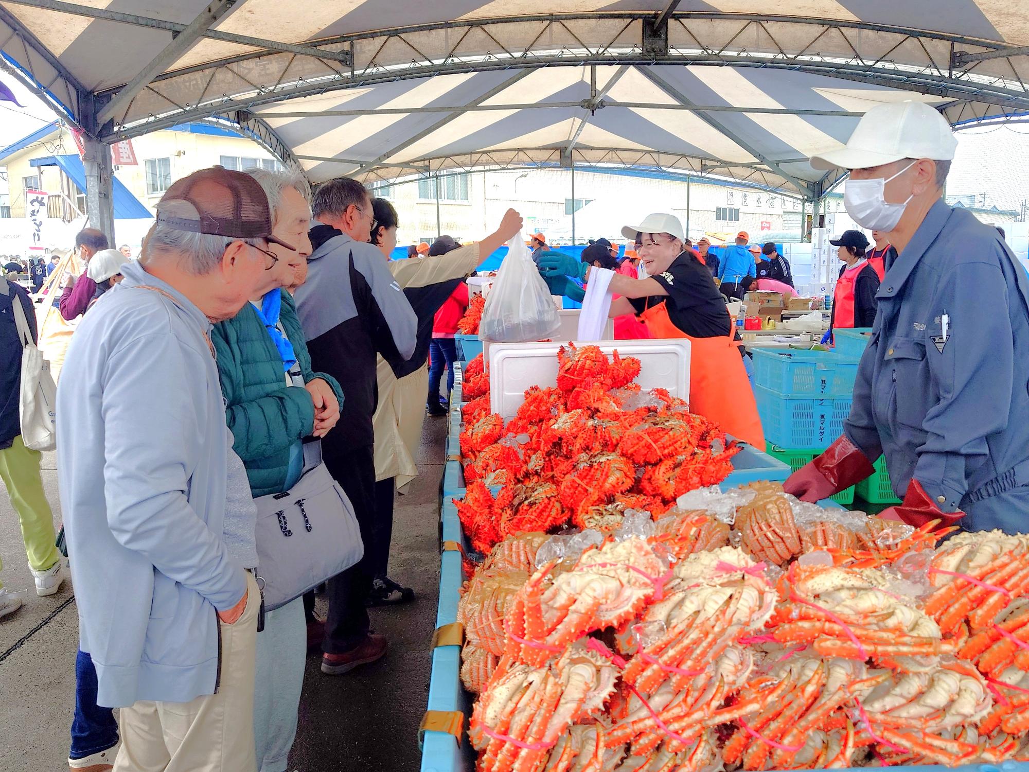 グルメ販売では、かに大特価販売をはじめ、焼きガニや鉄砲汁などが並び、多くの来場者が旬の味覚を堪能。