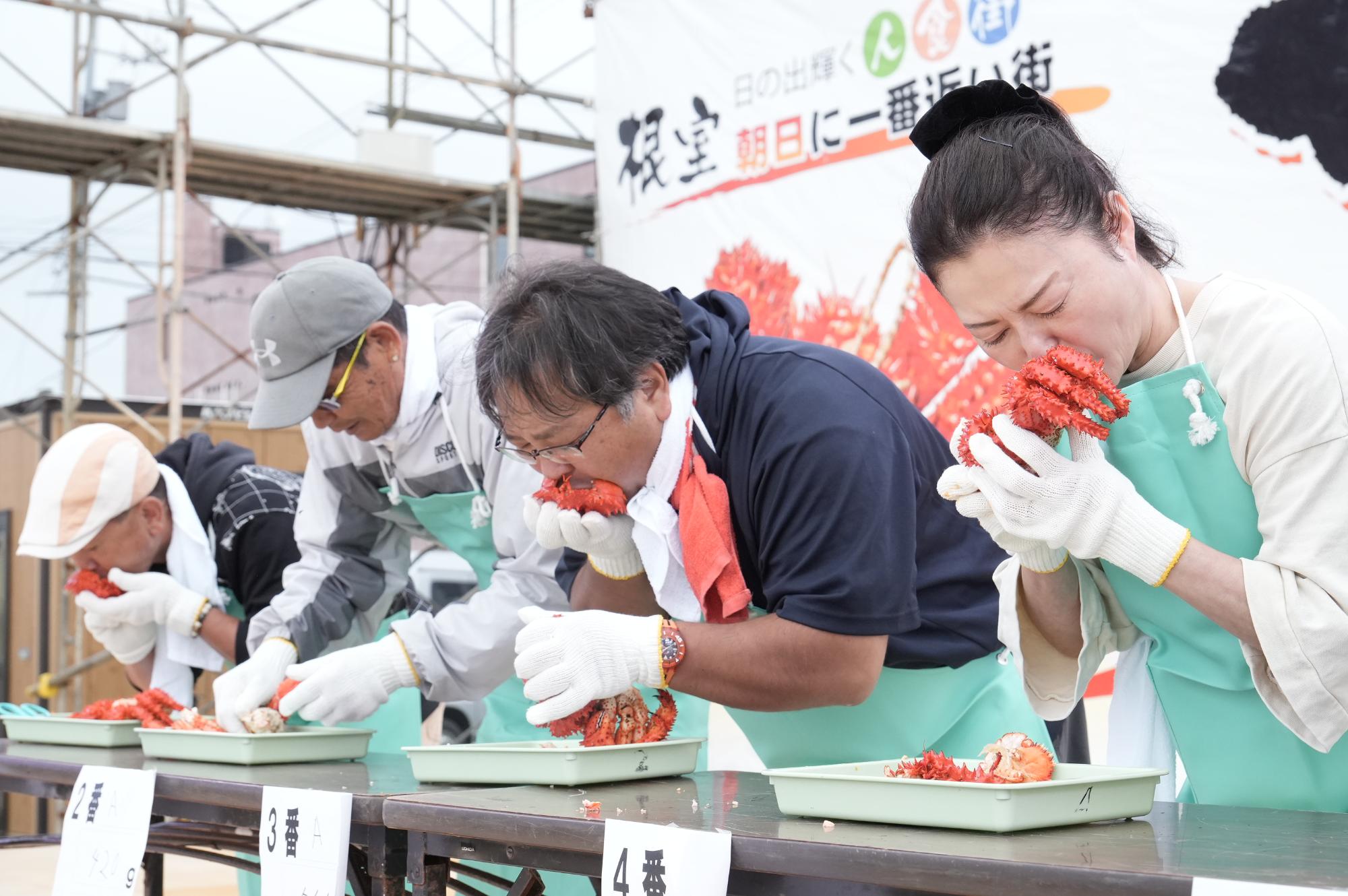 名物イベント「かに取り合戦早喰い競争」では、豪快にカニに挑む参加者に歓声があがりました。