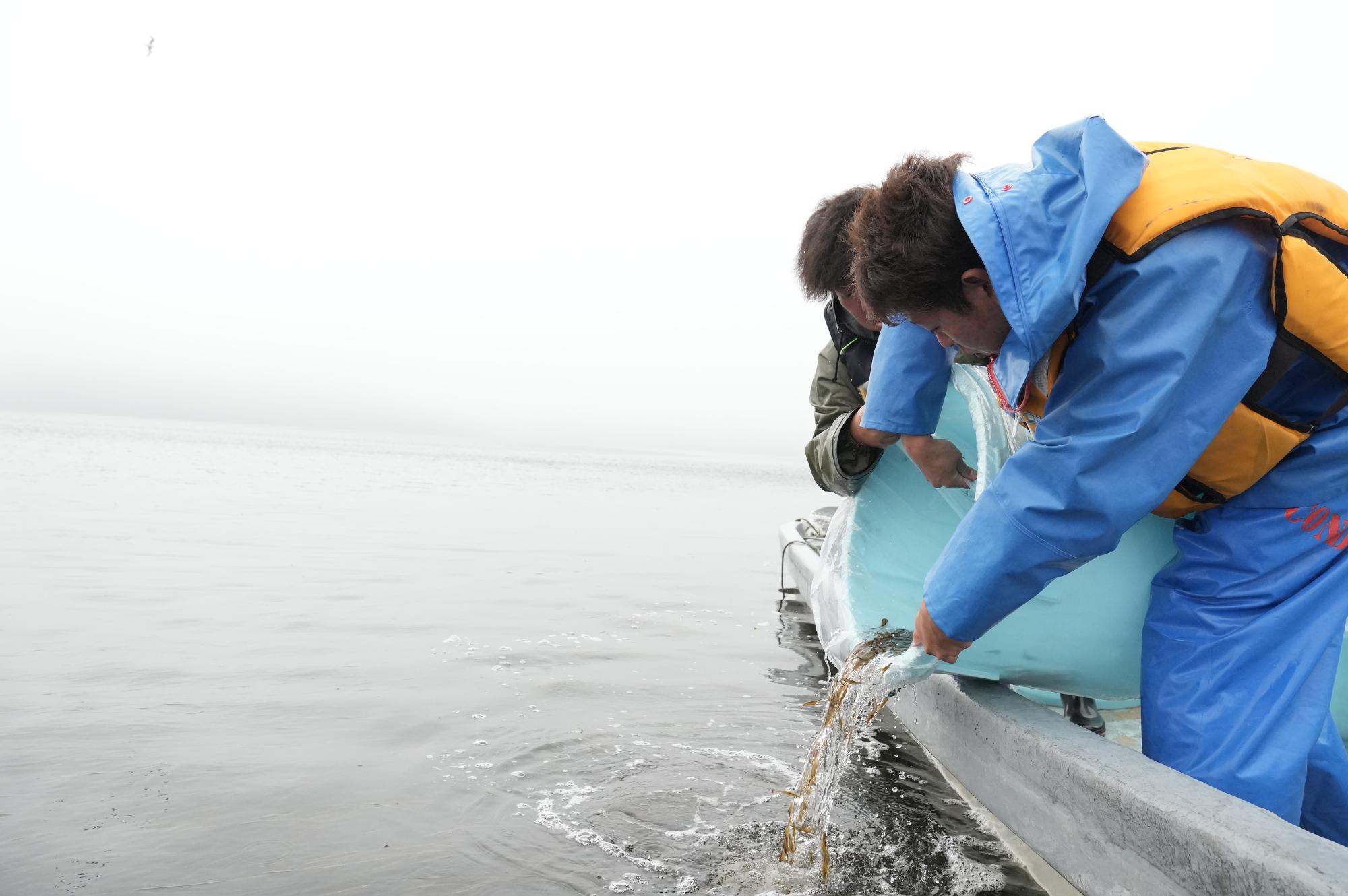 今年は5月に抱卵した親エビ329尾を確保し、ふ化した約10万3千匹の稚エビを水槽で約2ヵ月間育成。その結果、5万9千尾生産(生残率57.3%)され、うち5万4千尾を4日間に分けて放流しました。