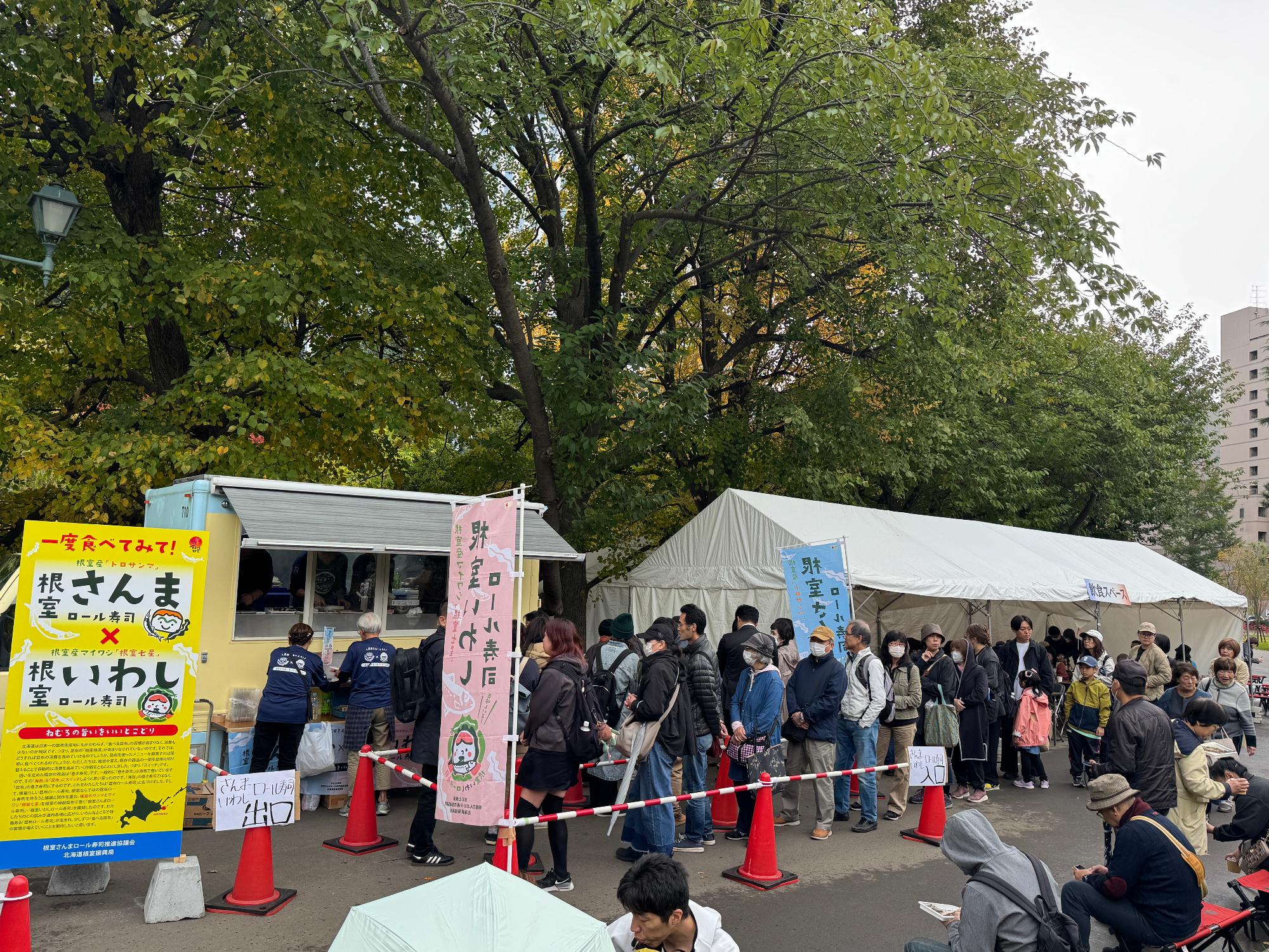 今年は庁舎改修の完了により、例年の物販に加え、「根室さんま・いわしロール寿司」や鉄砲汁を販売。特に6年ぶりに実施した「さんまの炭火焼き」が注目を集めました。