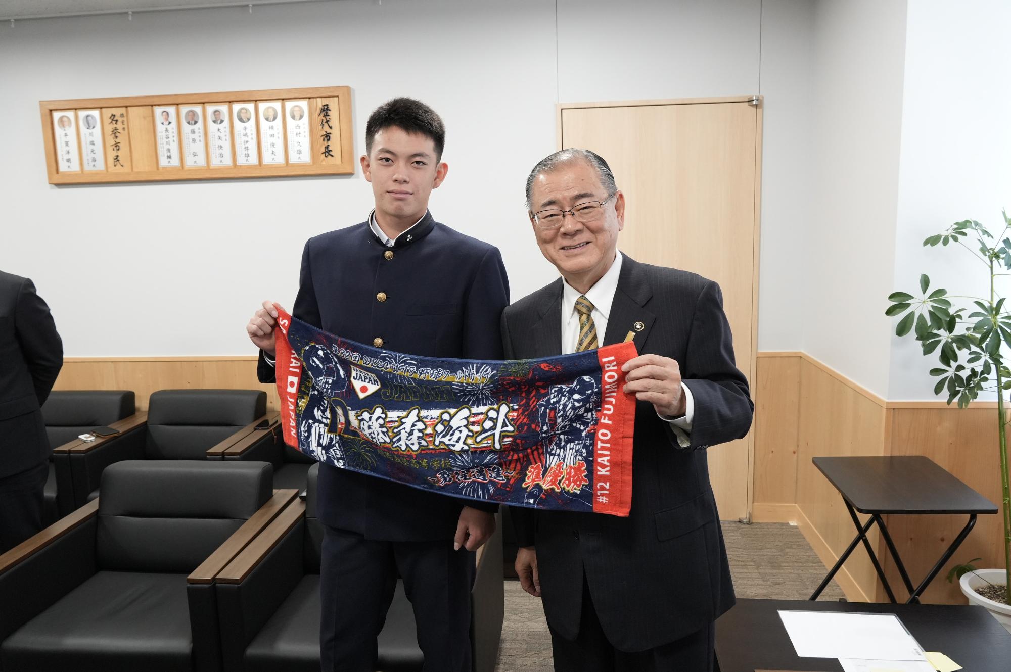 北海道日本ハムファイターズからドラフト5位指名を受けた、花咲小出身の藤森海斗選手が、市長を表敬訪問しました。