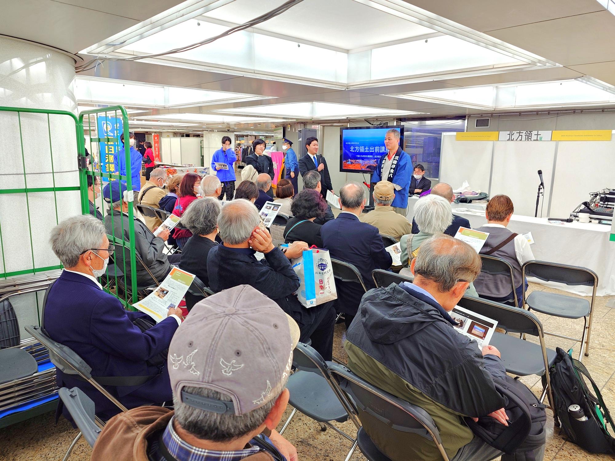 また、11月30日から12月2日までの3日間、新宿駅西口広場「イベントコーナー」を会場に「北方領土展 in Tokyo」を開催しました。会場では、北方領土に関するパネルやジオラマ、剥製の展示のほか、クイズラリー、根室管内1市4町の特産品販売などを行い、多くの来場者に北方領土問題への理解を深めていただきました。さらに、12月1日には初めて根室高等学校北方領土根室研究会生徒による「北方領土出前講座」を実施。生徒が北方領土の広さや歴史を分かりやすく伝えるなど、若い世代が自ら発信する取組として会場の関心を集めていました。