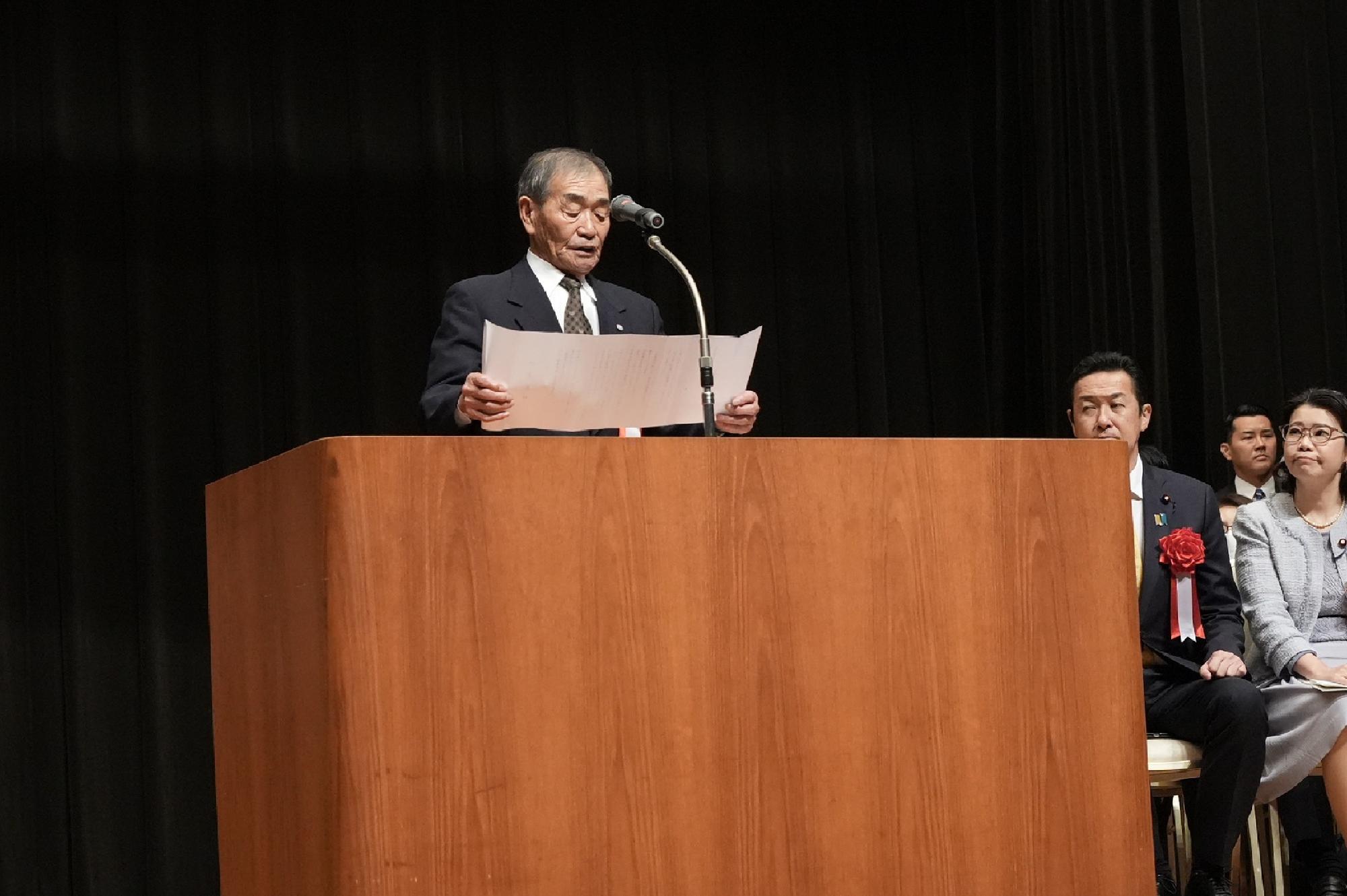 アピール行進を実施した12月1日は、昭和20年、当時の安藤石典根室町長がGHQに対し北方領土問題の陳情書を提出した「返還要求運動はじまりの日」。今年は日比谷野外音楽堂の工事により銀座ブロッサム中央会館に会場を変え、出発式を行いました。式では、主催者を代表し石垣市長が「この厳しい時にこそ、北方領土問題の早期解決に向けた志をさらに高く掲げ、全国民が一丸となって、北方領土返還への強い意志をここ東京の地から、私たちの決意と覚悟、熱い思いを発信しよう」と力強く訴えました。続いて、歯舞群島・多楽島出身の工藤繫志さんが「返還要求運動の火を消すことなく邁進し、北方領土問題の早期解決に向け力強く行進する。」と決意表明しました。