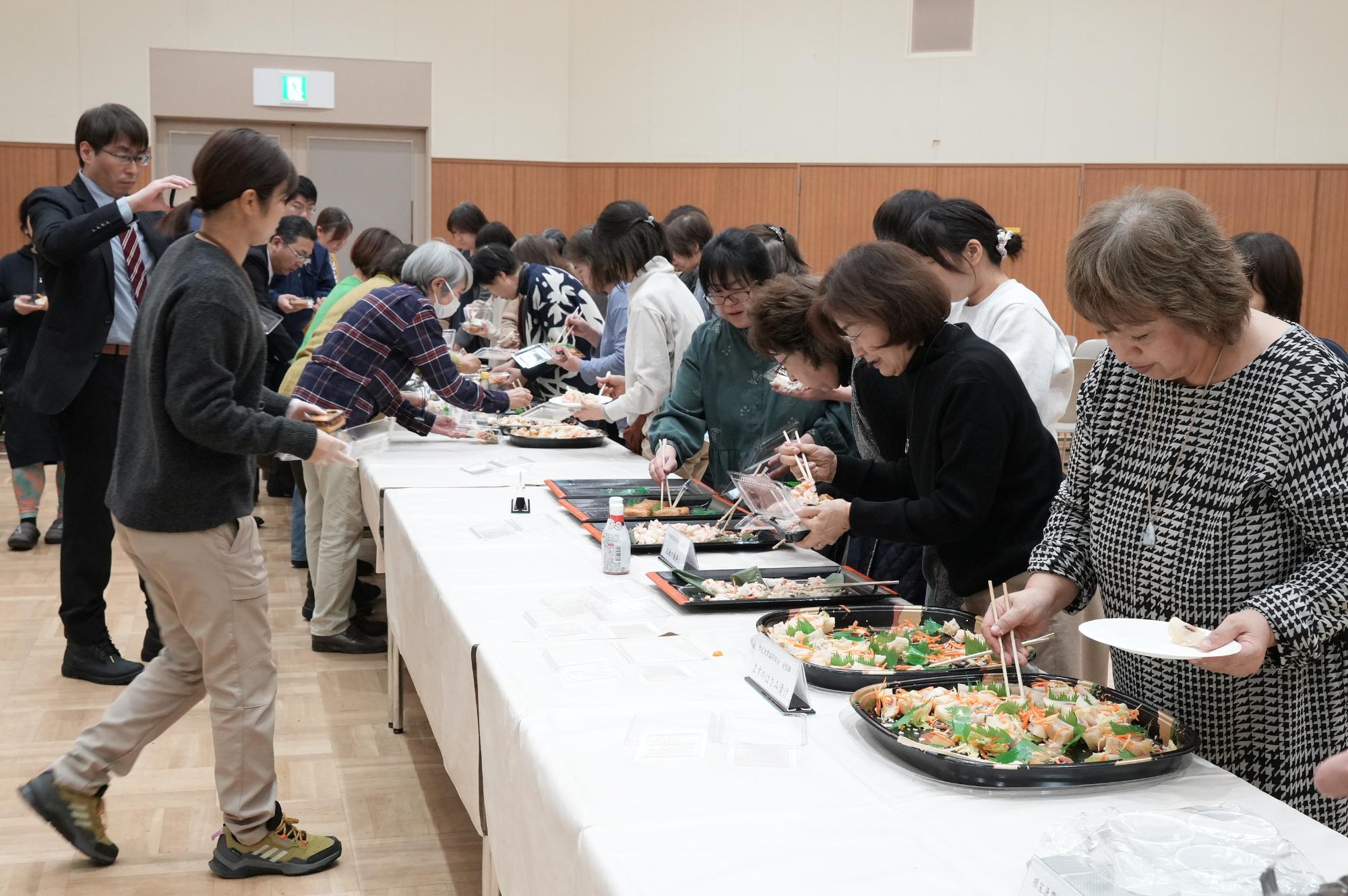 ねむろ水産物普及推進協議会(愛称:まるごと根室)は、11月に実施した「浜の母ちゃん直伝!根室おさかな漬物教室」で受講者が作成した漬物の合同試食会を開催しました。当日は、講師を務めた市内4漁協女性部をはじめ、関係者約80名が参加し、「紅鮭の飯寿し」「ますのはさみ漬け」「さんまの飯寿し」「こまいの切漬け」の4品目のほか、各漁協による一品料理が振舞われ、漬物の出来栄えや料理の味わいを楽しみました。