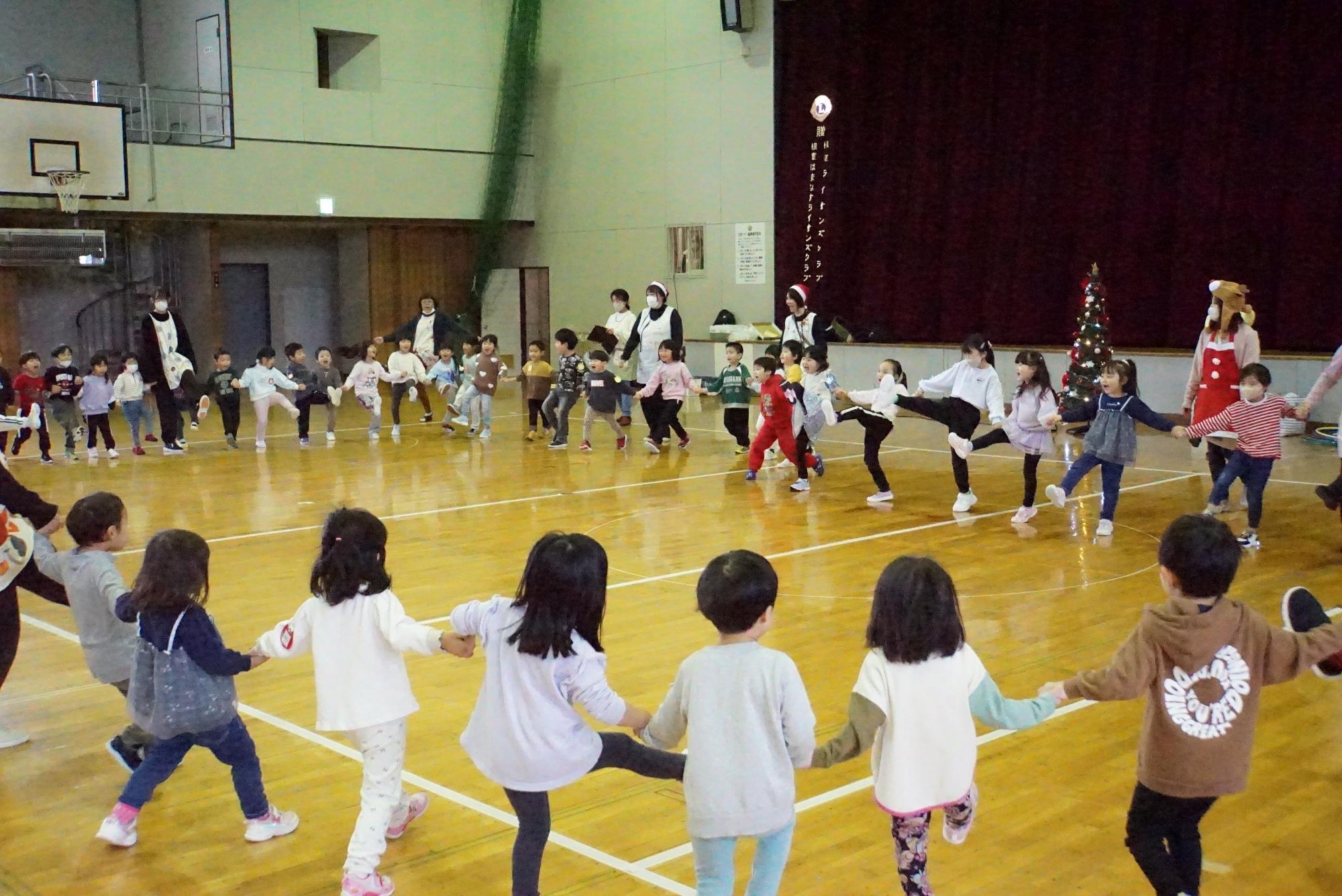 市内のまつもと、こまば、落石、厚床の各保育所の3~5歳児クラスが集まり、青少年センターでクリスマス合同交流会を行いました。参加したのは保育士と園児あわせて82名。はじめは他の保育所の友だちに緊張する様子も見られましたが、すぐに打ち解け、ゲームやダンスを通して笑顔が広がりました。クリスマスイブのこの日は季節外れの雨となりましたが、広い体育館いっぱいに体を動かし、元気いっぱい交流を深めました。