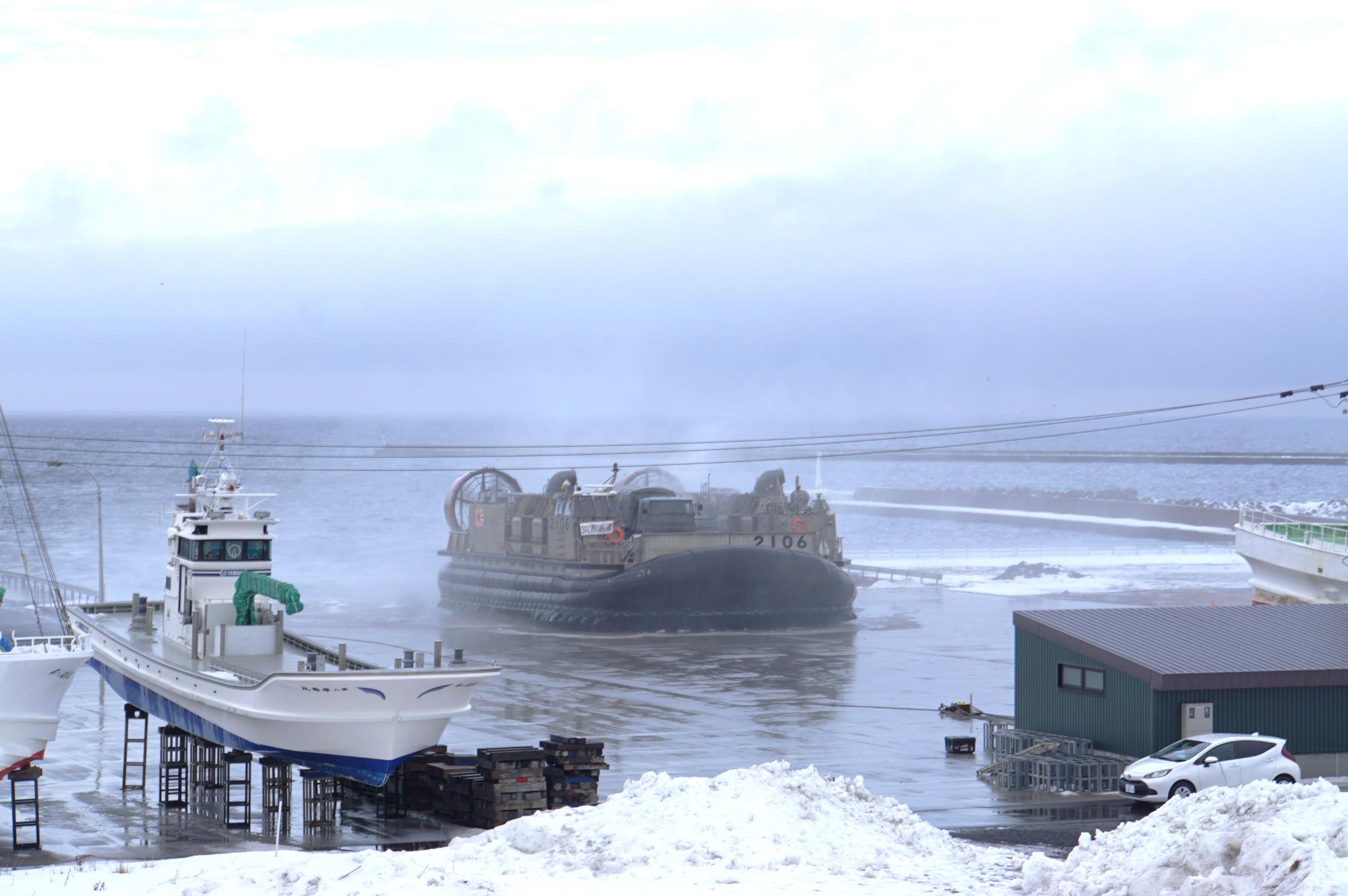 根室市と自衛隊は、大規模地震や津波により陸路が寸断され、太平洋側の港湾施設が被災した事態を想定し、「総合連携災害対応訓練」を実施しました。陸路の代替として海上輸送により、海上自衛隊輸送艦「くにさき」とLCACを用い、支援物資や重機などを根室港に搬送。揚陸後は、陸上自衛隊や航空自衛隊と連携し、物資輸送などの手順を確認しました。海上からの物流確保を軸に、関係機関の連携体制と受援能力の実効性を確認する訓練となりました。
