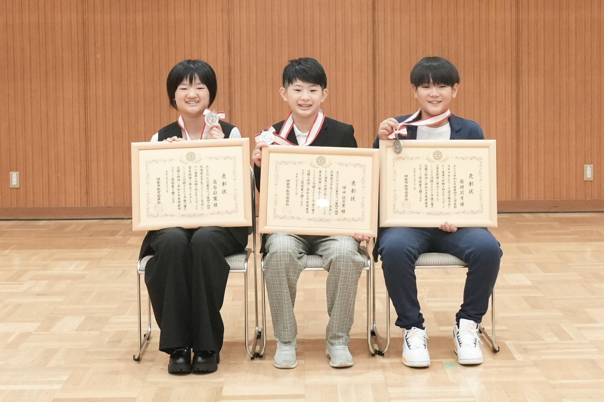 根室市スポーツ奨励賞表彰式が行われ、3名に賞が贈られました。今年は、バドミントンの高谷彩葉さん、田中依万里さん、レスリングの岩崎莉月さんが受賞。全道大会や全国大会での優秀な成績が高く評価されました。高谷さんは受賞者を代表し、これまでの努力が実を結び受賞に至った喜びとともに、家族や指導者など周囲への感謝の意を表し、「今回の受賞を励みに、今後も各大会で活躍できるよう頑張っていきたい」と述べました。