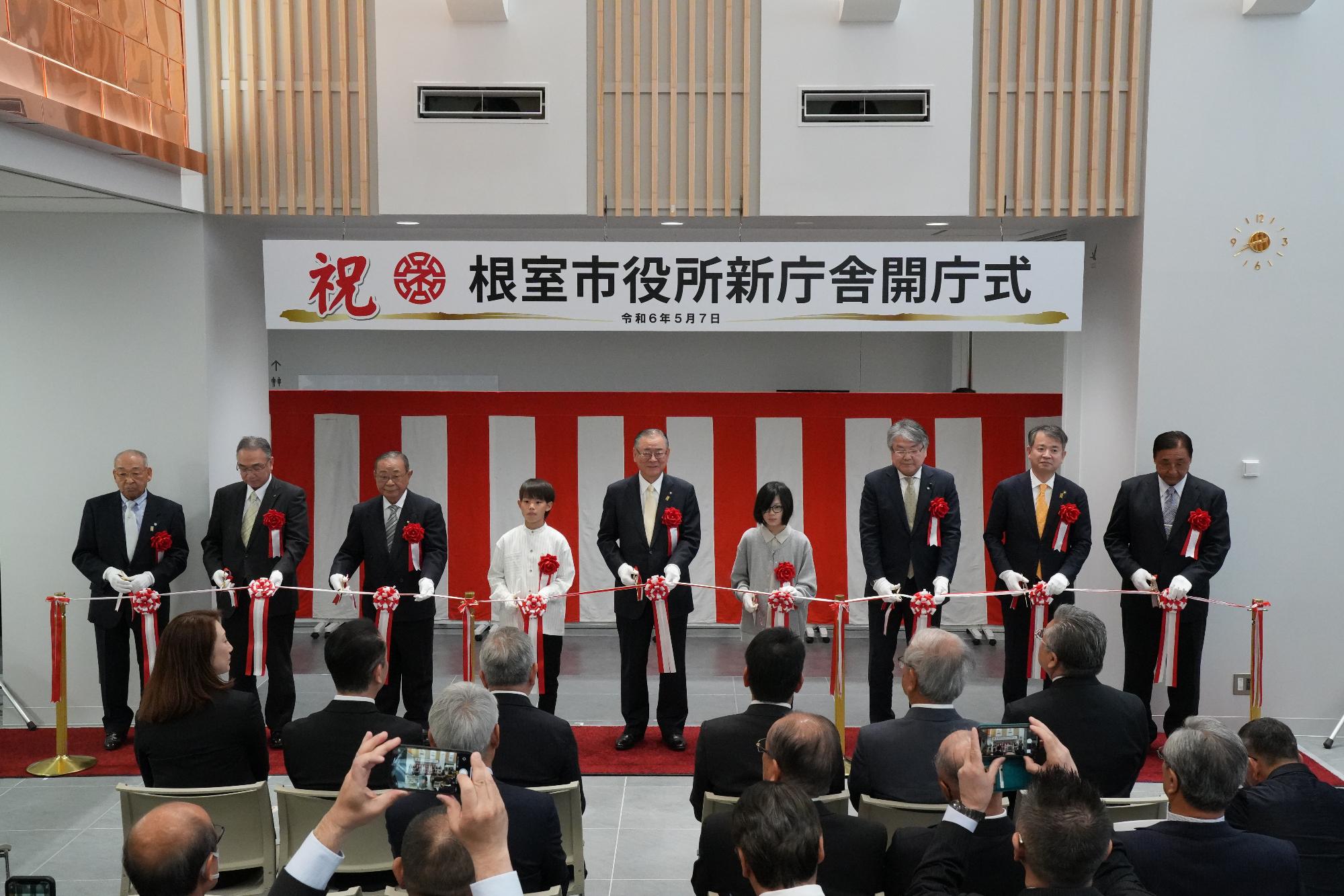 開庁式では新庁舎の設計・監理並びに施工に尽力いただいた各事業者に感謝状の贈呈を行ったほか、新庁舎の開庁を記念したテープカットを行いました。