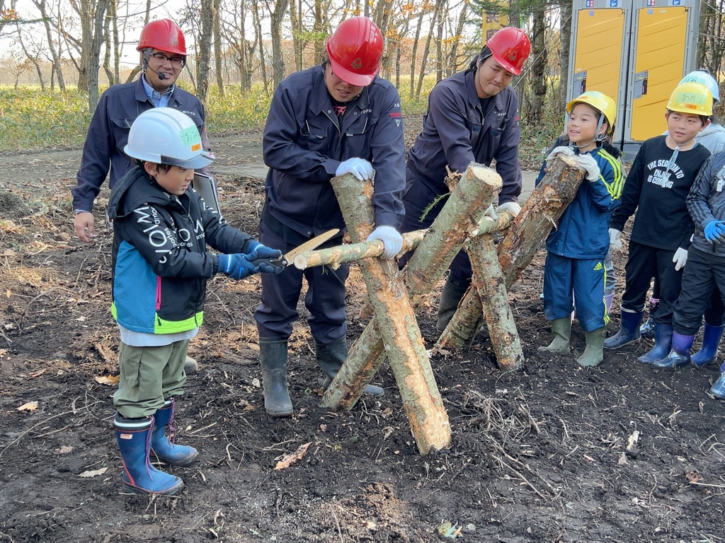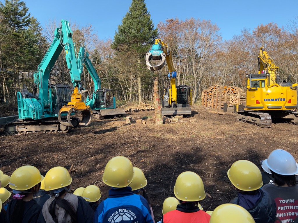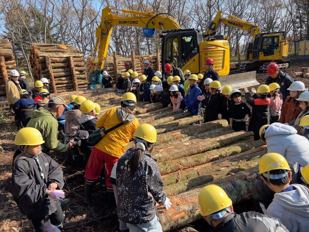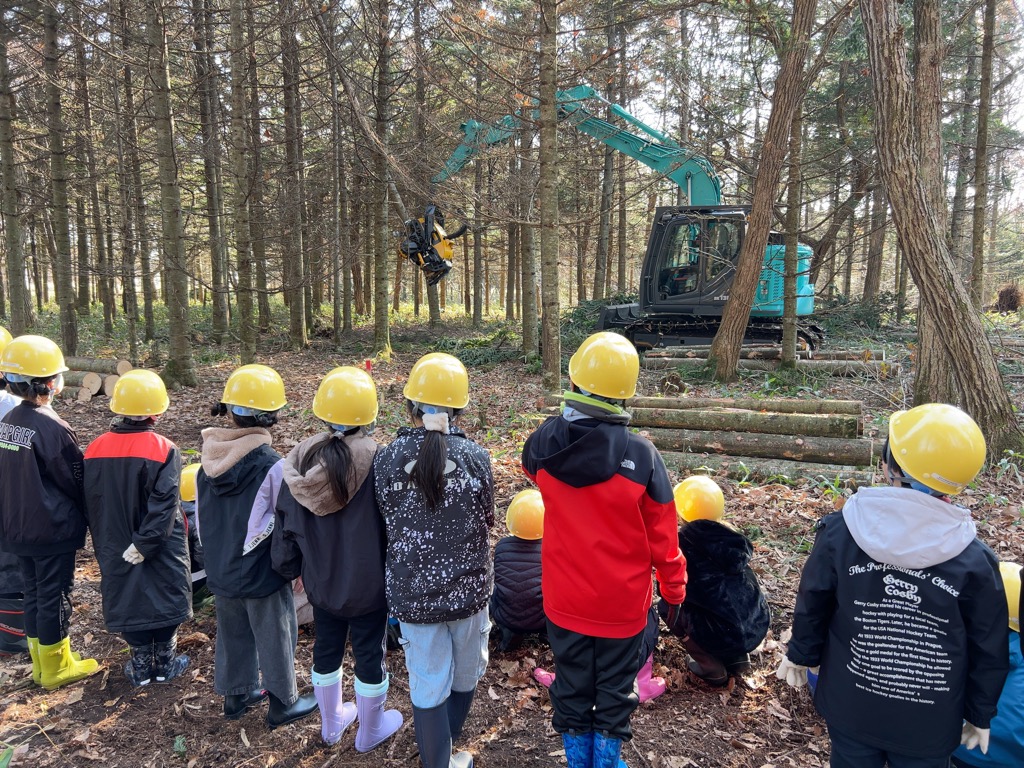 児童たちからは、重機の作業実演を見学し、「かっこいい!」「すごい!」との声が聞かれました。高性能林業機械で木を伐る作業を間近で見ることや木に触れることで、林業に興味を持ってくれる子が増えてくれると嬉しいです。