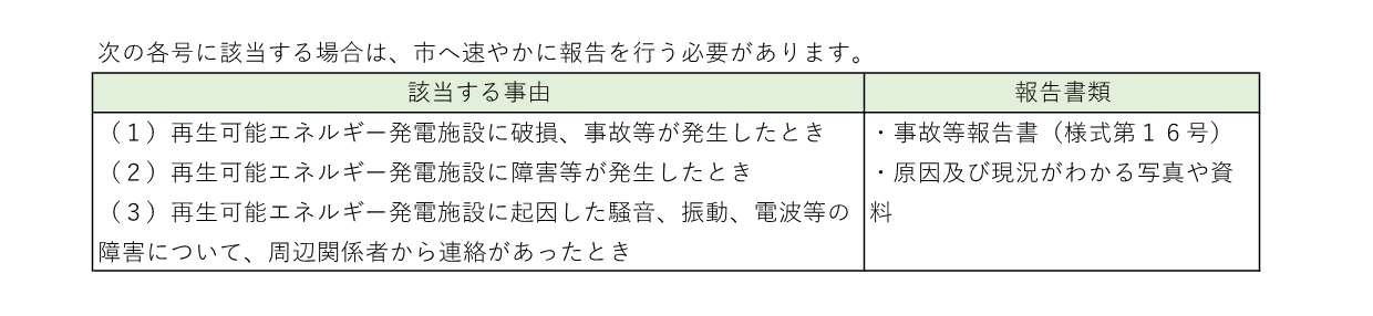 再生可能エネルギー発電事業を実施する間、災害又は生活環境等の保全上支障が生じないよう保守点検及び維持管理に関する計画書(様式第8号)に基づき、再生可能エネルギー発電施設及び事業区域内を常時安全で良好な状態となるよう維持管理しなければなりません。