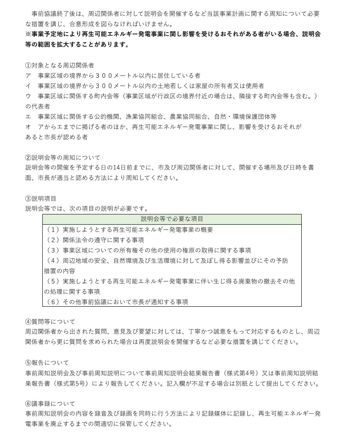 再生可能エネルギー発電施設の設置事業を行なおうとするときは、その事業計画について、事前調査を行い、その結果を報告した上で、事前協議を行う必要があります。事前協議を終えた事業者は、周辺関係者等に対して事業計画に関し説明会等を実施し、合意形成を図らなければなりません。