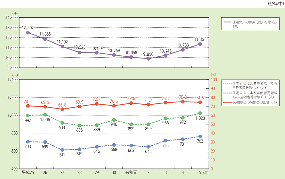 住宅火災の発生件数と死者数の推移